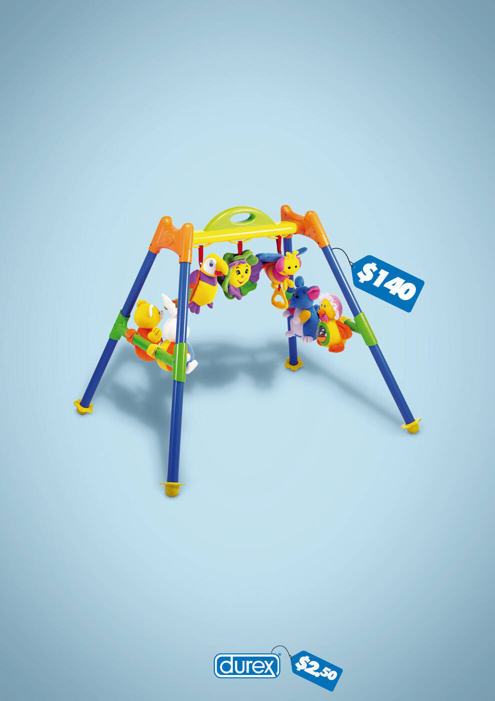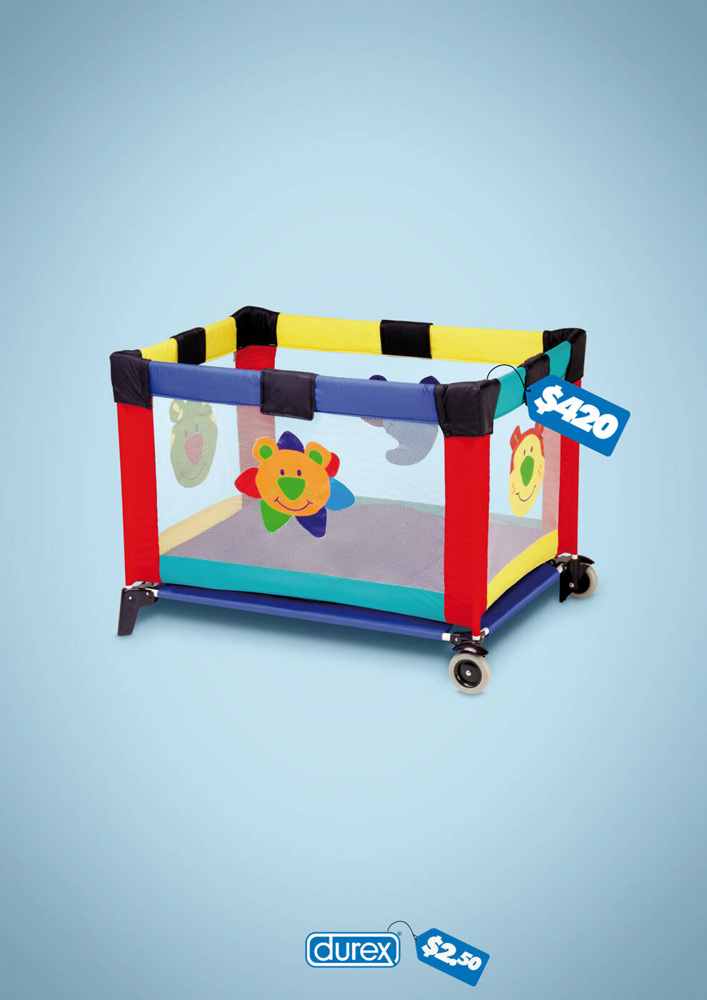 By comparing the price, the ad humorously implies that using Durex can help prevent unintended pregnancies and the subsequent financial responsibilities of parenthood.